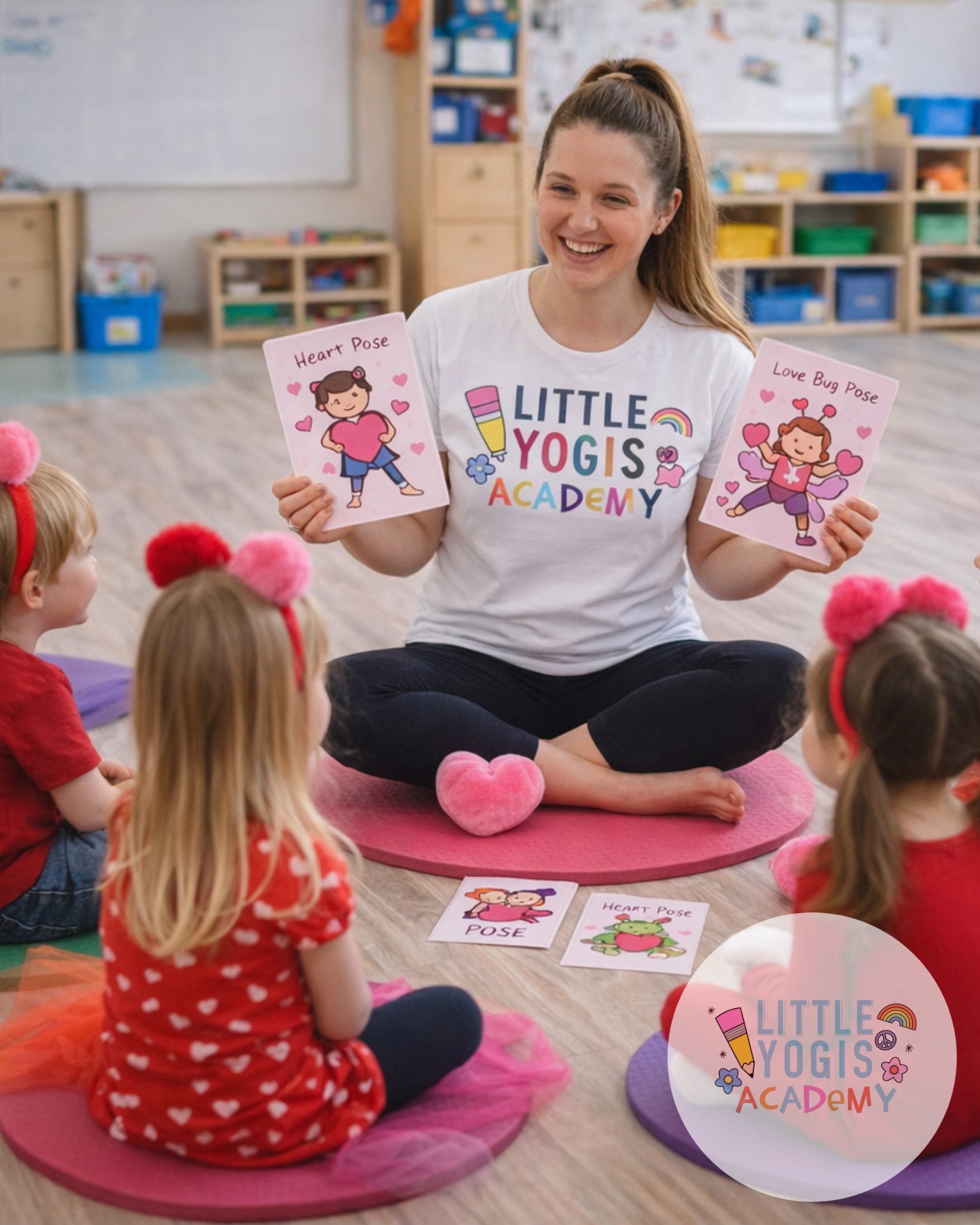 Valentine’s Day in a kids yoga class isn’t about romance. It’s about connection, kindness, emotional literacy, and joy-in-motion. Think hearts that breathe, partners that giggle, and poses that glow with empathy.